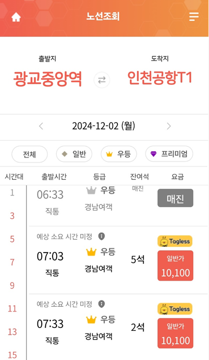3. 출발지에 (동수원) > 도착지에 (김포공항) 입력